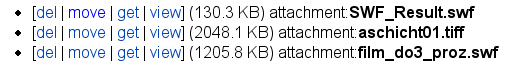 Um Dateianhänge in eine Seite einzufügen sollte unbedingt eine Angabe wie attachment:dateiname benutzt werden, wie sie auch in der folgenden Liste der Dateien erscheint. Es sollte niemals die URL des Verweises ("laden") kopiert werden, da sich diese jederzeit ändern kann und damit der Verweis auf die Datei brechen würde.- [laden | anzeigen] (2010-04-16 11:02:00, 7.4 KB) [[attachment:move_example1.png]]